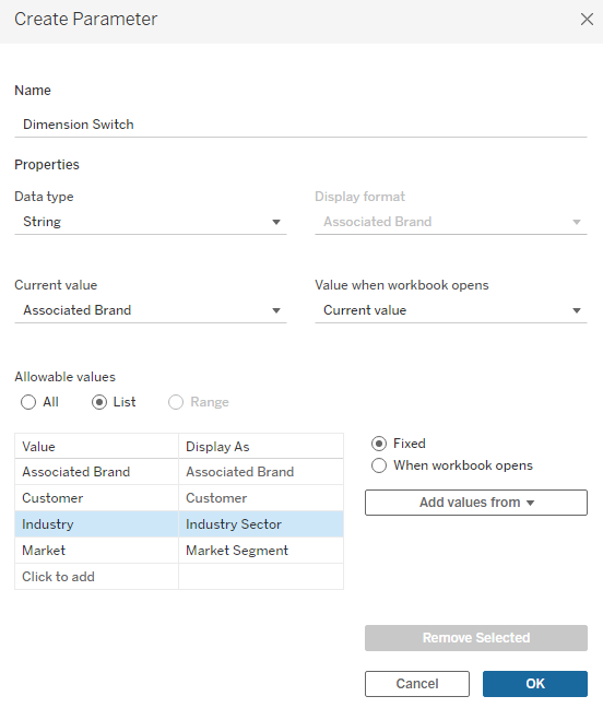 - Add a list of Allowable Values that match the dimension names you want to switch between