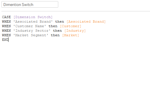Next, you need a calculated field that links the parameter to the underlying dimensions in the data.