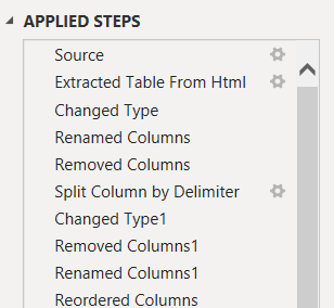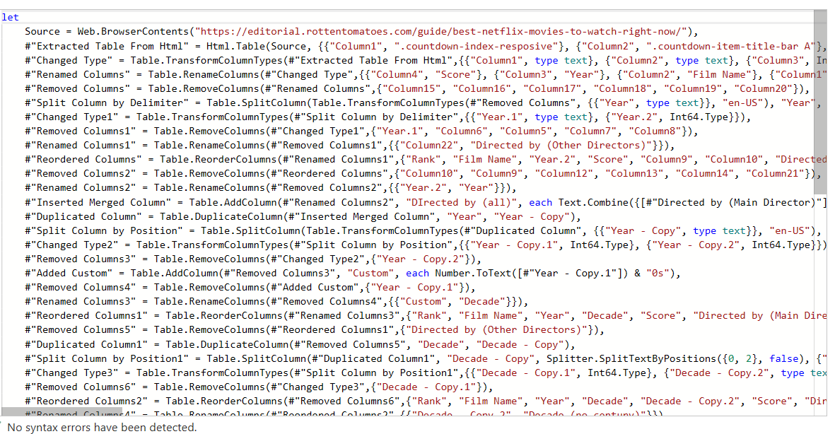 You can also make use of the advanced editor feature which will keep track of your manipulation in text form in a language called M. It should look something like this (for a data set I imported from Rotten Tomatoes, https://editorial.rottentomatoes.com/guide/best-netflix-movies-to-watch-right-now/):