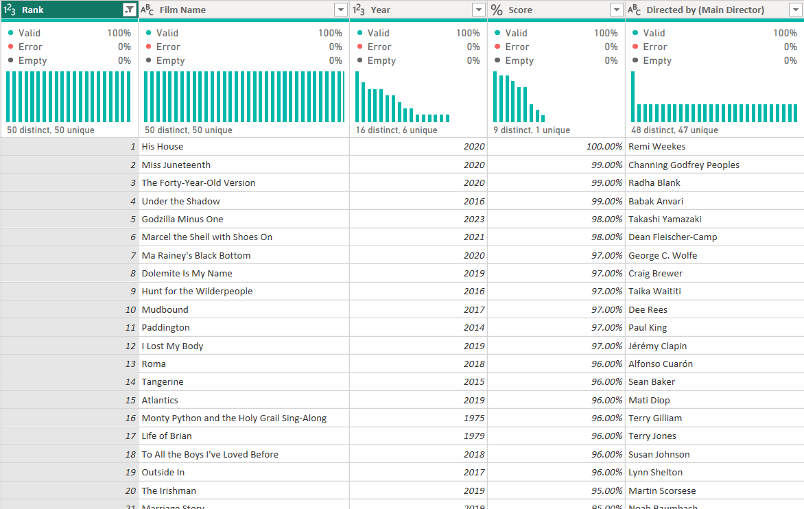 Power BI integrates data preparation and visualisation into one application, so one can find PowerQuery (prep) and Power BI Desktop (visualisation) under the same roof. Once you import a data source it will display in a preview panel in tabulated form. In order to keep track of the steps taken in cleaning and preparing your data, a sidebar will keep track of your progress and should look something like below: