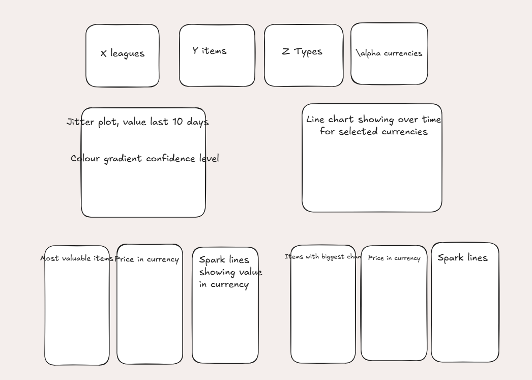 After consideration I added a bit of more context by allowing a user to select a type of item or currency and look at the distribution of the same type (using logarithmic scaling because some items have chonky prices squishing the jitter plots).