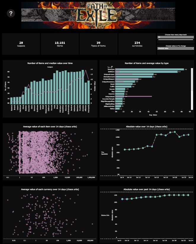 On the third day of dashboard week our coaches gave to me... a data dump on the video game Path of Exile. Path of Exile is an online action RPG that has a sophisticated trading system that players track day by day (s0metimes multiple times a day), creating an internal economy within the video game.