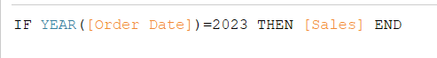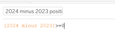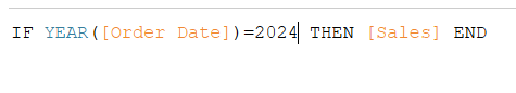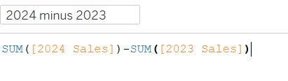 The first thing to do is to create two aggregated fields; 2023 sales and 2024 sales. These can be done with If statements as below: