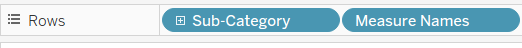The next step is to make use of measure values. Firstly, drag Sub-category and measure names into the rows shelf.