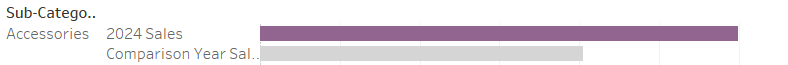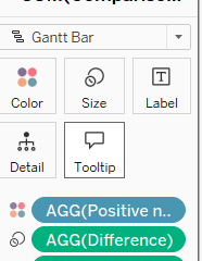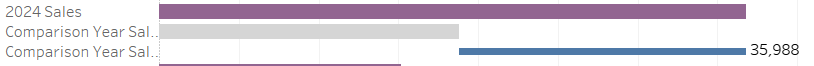 Next we want to make a Gantt bar chart. To start, Drag 2023 sales onto your columns shelf to create a second axis. Switch the mark type to Gantt and you should have notches indicating the sum of sales in 2023. By now dragging 2024 minus 2023 (named difference below) onto the size card in your Gantt's marks shelf.