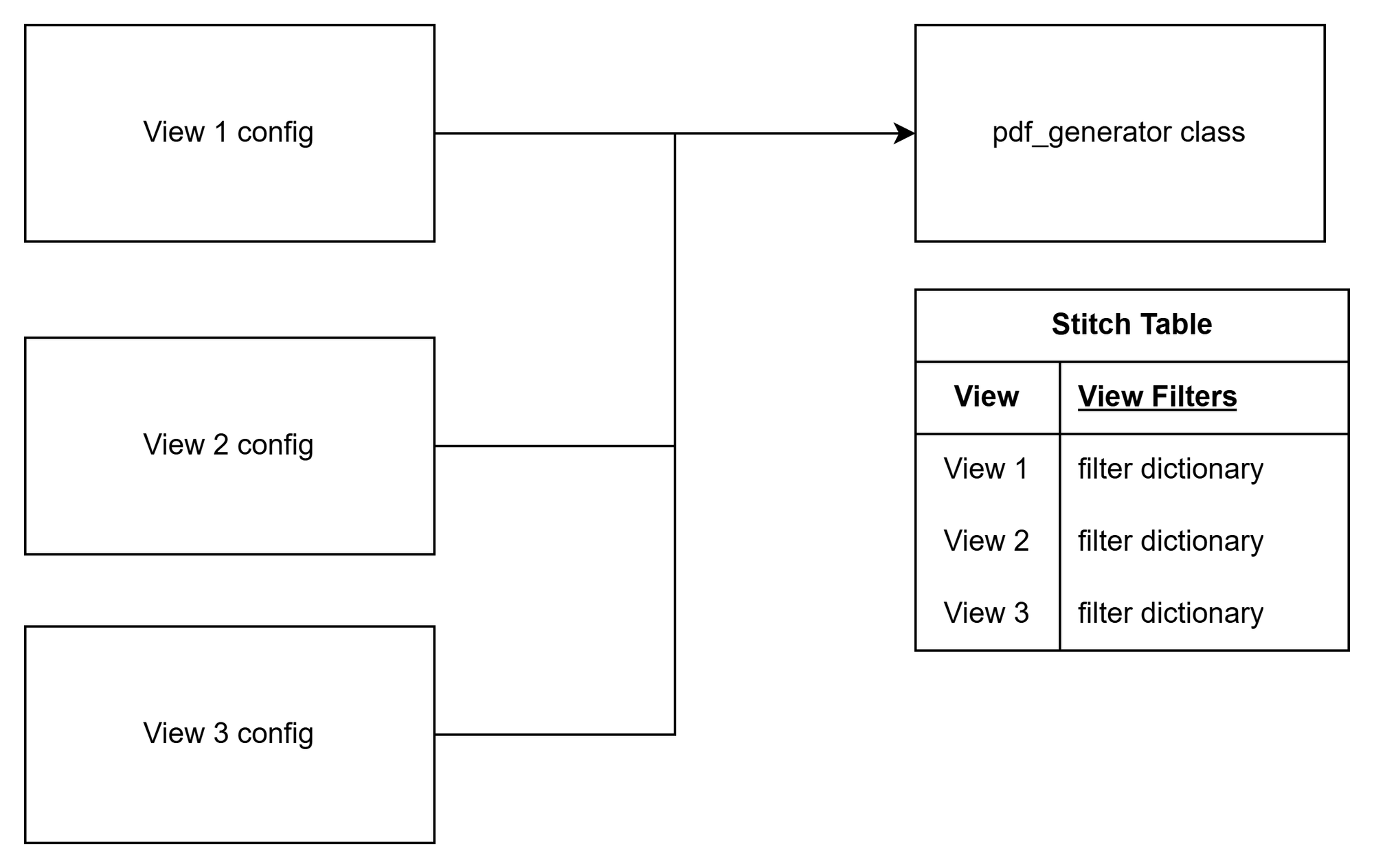Once all views have been inputted, the user calls upon another method in the class called "generate_pdf". This method takes the final stitch table, arranges views in order (more on this later), and then passes it into TSC (and ultimately the _FilterOptionsBase class). The result is a neatly packaged PDF created from potentially multiple views. Optionally, users can decide to embed or attach the PDF in an email.