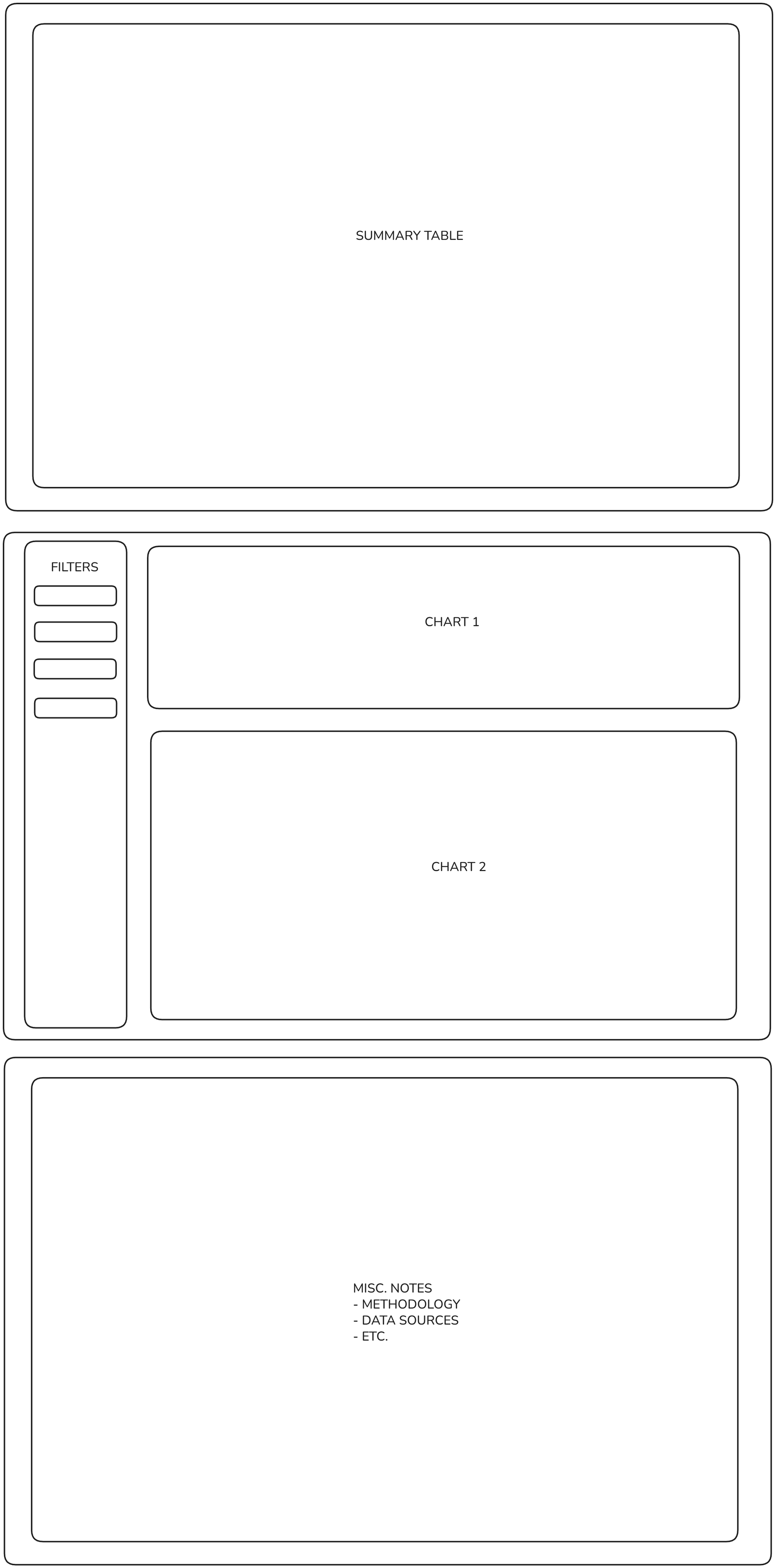 First, I'll lay down some context. Below is a wireframe of a typical workbook I built for my client. The first dashboard is a static summary page; the second dashboard is an interactive drill-down; and the third contains miscellaneous notes.