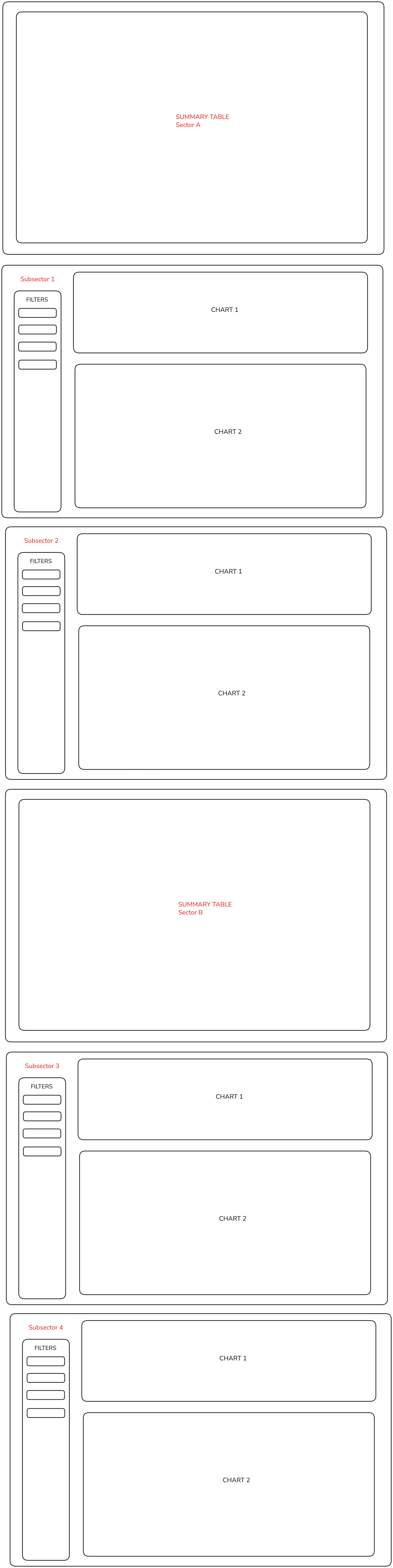 Next on my list was to find a way to optionally stack pages in some hierarchy. The wireframe below lays out the scenario. Let's say we have two dashboards we want to print. The first is an interactive dashboard that contains summary data per sector. The second is dashboard used to drill-down to subsectors within those sectors. Without a sorting logic, the PDF will print all sector summary pages first, then all subsector drill-down pages. This may be fine but based on client requirements, I needed an easy way to "nest" drill-down pages under their relevant summary pages.