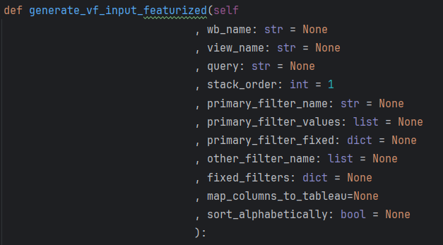Because I am directly pulling the data source of the dashboard from Snowflake to help create view filters, it can be tricky when trying to configure a view with calculated fields. Although I have built in processes to handle situations like this, the process can break depending on the complexity of the dashboard. The rule of the game at my client is to keep dashboards as simple as possible to avoid having to create view filters based on calculated fields or parameters (I have created an entirely different process for cases like this, but that's for another blog). Fortunately, all business logic lives in python so there is rarely a need for new fields in Tableau, except for formatting or interactive purposes.