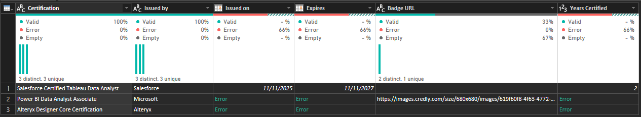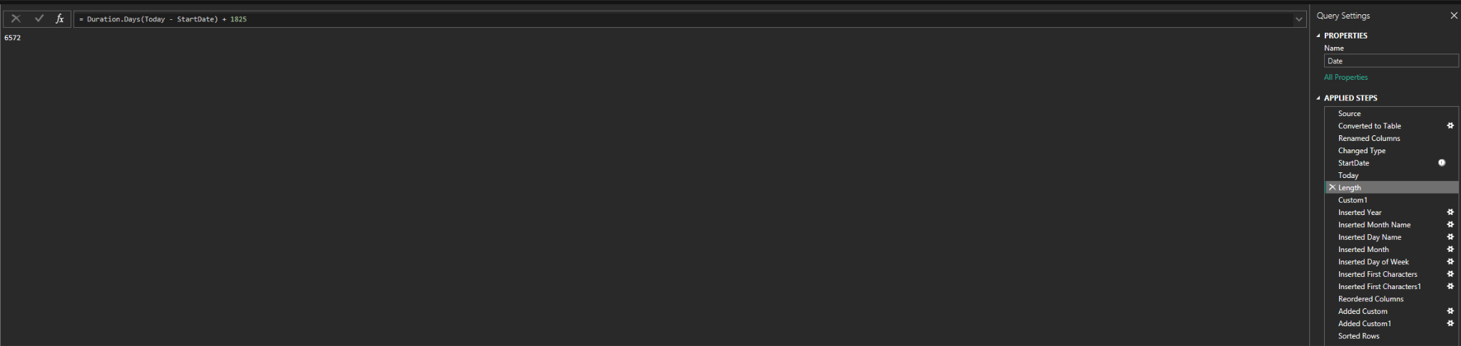 Another issue was that my date table stopped at the year 2025. This meant that the duration of some of my certifications could not be calculated properly. The fix was simple but not immediately obvious. I opened the date table in the length step and extended the calendar by adding extra days until it reached the end of 2030.