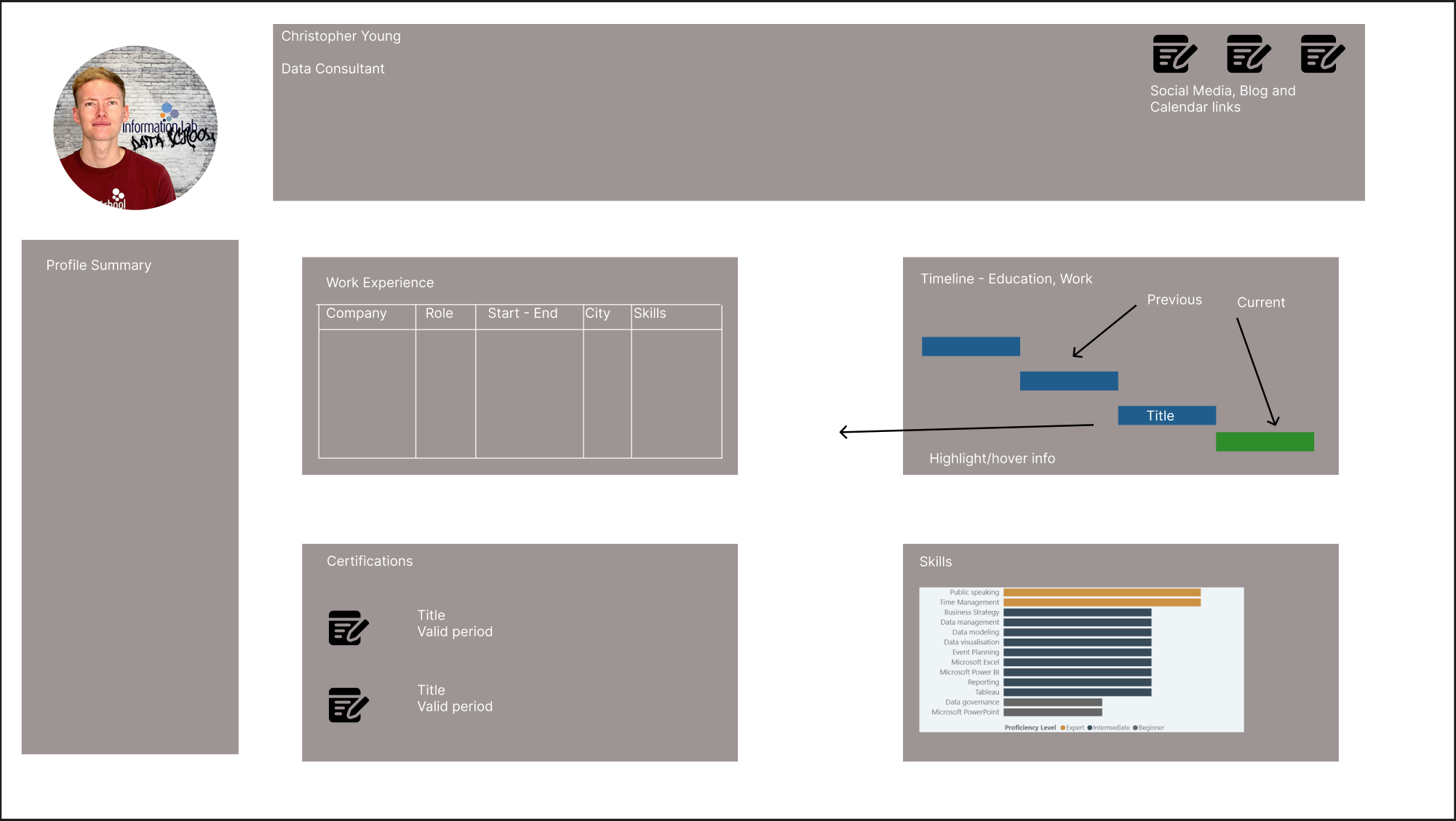 After that I moved on to the design phase. I looked at examples that inspired me. One dashboard used a Gantt style bar chart and a very clean layout where the social media icons were separated from the about me section. Another dashboard used coloured bars to show technical skill levels which I found helpful for thinking about how to communicate my own experience. I sketched out a rough layout based on elements I liked from both examples.
