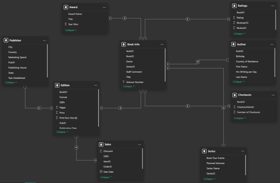Fact Tables store quantitative data, measures that are numeric. For example, sales or number of orders. They include foreign keys that are the basis of linking to dimension tables. Normally this is used as the basis of analysis purposes and decision making. For example, the "Book Info" table acts as the central table in the Bookshop data, where all other dimension tables come off from.