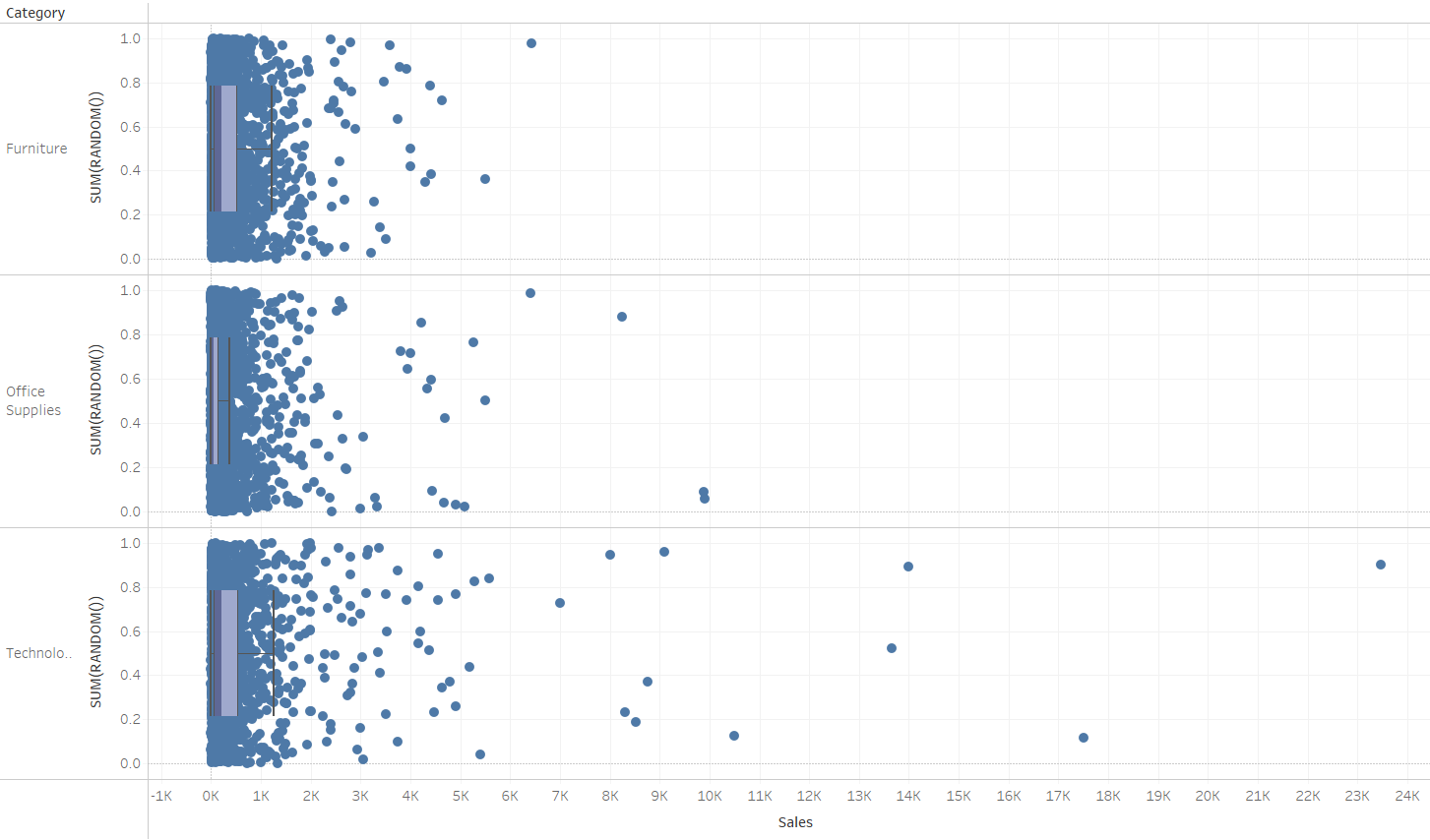 We began learning about the analytics pane, and some of the useful tools it can provide when trying to add context to graphs created in Tableau. We covered summary tools such as the average and constant lines, as well as the Distribution Band's, Clusters, Dynamic Bins, Box & Whisker Plots, and potentially the most visually satisfying one, the Jitter Plot. The image below showcases how it can help to show a user how densely packed data points are when they overlap. This is done by simply adding the calculated field SUM(RANDOM()) into the rows.