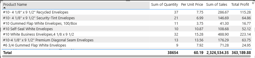 The table below indicates this. The Sum of Quantity x Unit Price gives the Total Cost, and when subtracted from Sales gives the Total Profit figure.