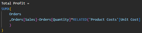 The short session on DAX in PowerBI focused on refreshing our existing Columns and Measures knowledge, whilst learning about iterator functions. These are the "X" functions, such as SUMX, which calculates a value for each row first and then adds up the results, while SUM would only add numbers in a single, pre-existing columns. There are more functions such as MAXX and AVERAGEX which perform an iterative calculation in a similar way. In the example below, the "Total Profit" calculation uses SUMX to calculate the profit per Product on a row by row basis, showing the profit for the product rather than as a total at the end of a pre-exisiting Profit Column.