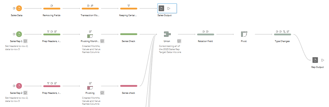 The Sales Rep tables were provided in a difficult format to load in Prep, and required multiple stages. Adjusting header positioning, pivoting to have values in columns and then back into rows in order for each of the sales reps to have monthly targets for the entire year assigned proved difficult due to the number of cleaning steps required. The main Sales Dataset included the entirety of the data collected by the company, required the discussion as a group to think of where to focus the scope. The rest of the process included making data fields to relate in Tableau, and standardising the Sales Rep name fields for the same reason. Documenting and explaining the process alongside recording the walkthroughs I found to be a fun process, which I hope to have the opportunity to do again. If you would like to read through Joseph Hughes' blog on his week, make sure to read it here.