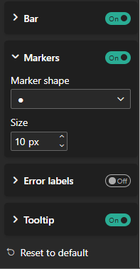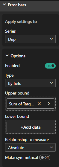 - Focus shifts to creating the curved ending to the bars. Select the graph, then under Visualisation Pane navigate to the Analytics tab. Scroll towards the Error Bars dropdown and enable them. For each field, you need to select the upper bound to match the targeted field or measure it refers to in the series. In the below example, Dep refers to the Department, and the upper bound is the Sum of Target Value. Under the Markers section, choosing the circle and sizing it to match the size of the graph in your dashboard. To show the numbers only on the progress bars, make sure to disable label values from the chart referring to the totals.