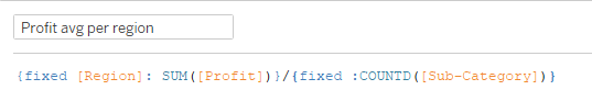 This fixed LOD adds up all Profit inside each Region and divides it by divides by the global sub-category count to create a fixed average for all sub categories.