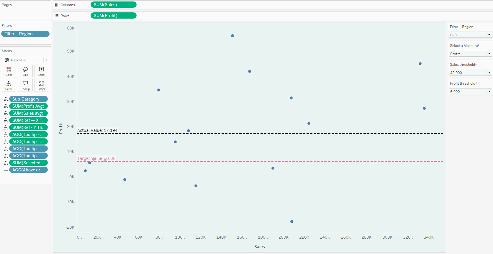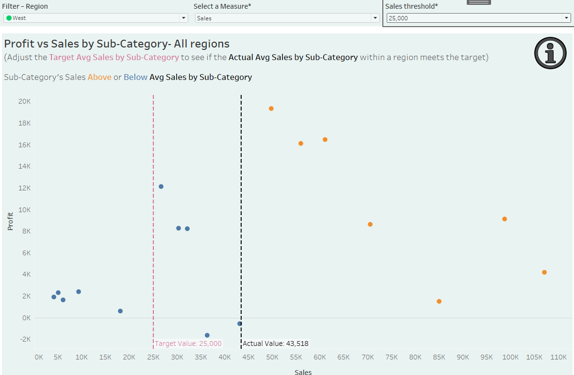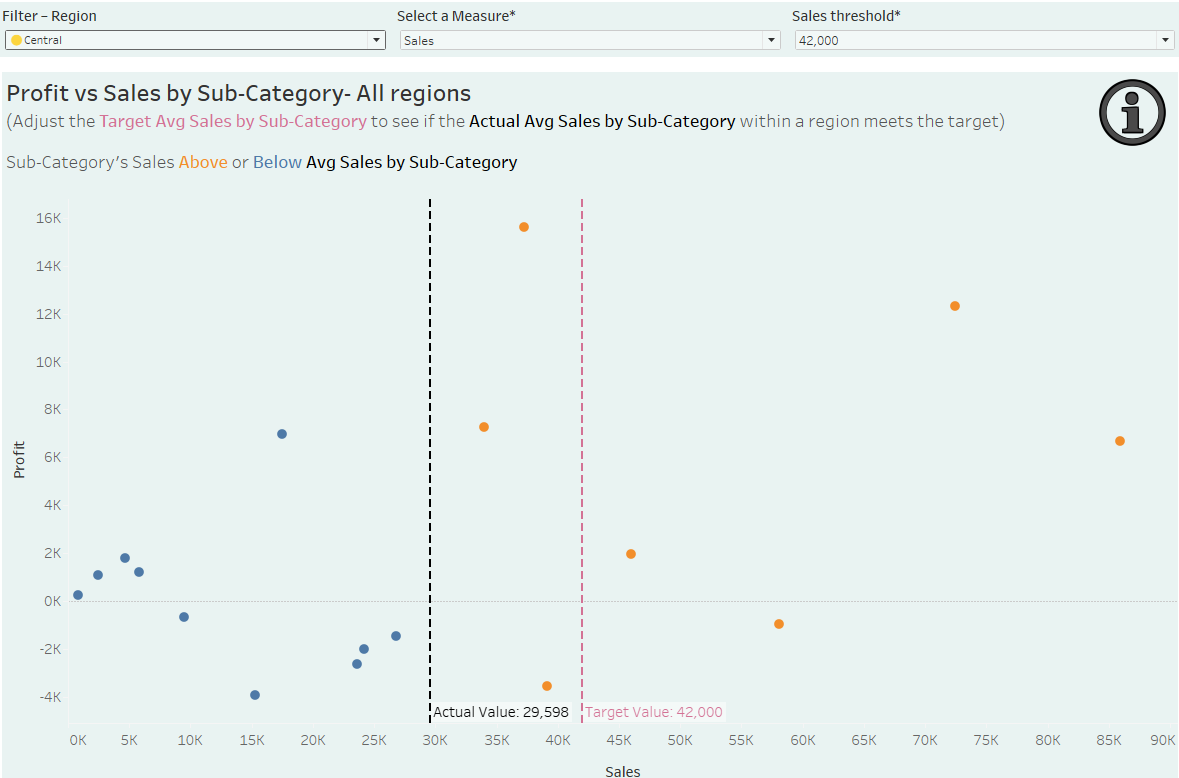 This will give us working indicators and dynamic visibility to show profit vs sales by sub category for all regions with a working colour coded filter!