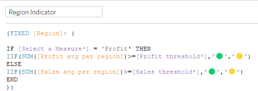 It checks the parameter to pick Sales or Profit, then uses the IIF function to return 1 when that mark is at/above its region’s average (else 0), giving a binary field for coloring.
