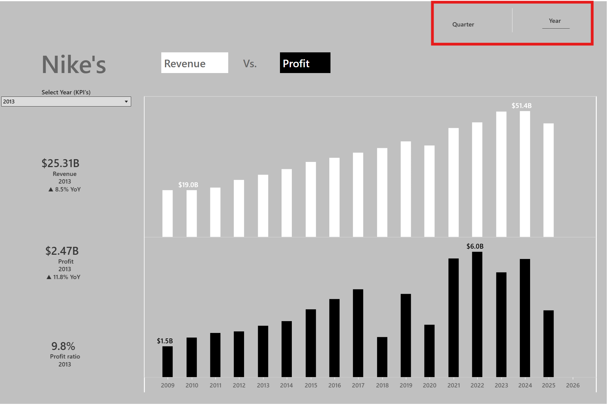 (In this example we want to switch between the same profit and revenue data for Nike, across years and quarters for the same time period)