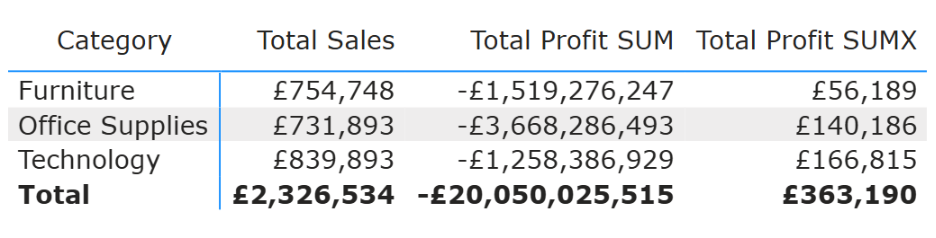 This ignores the row-level relationship between the fields, which is why the Total Profit result is massively inflated. To correctly work out the Total Profit, iterator functions (specifically SUMX()) are needed.