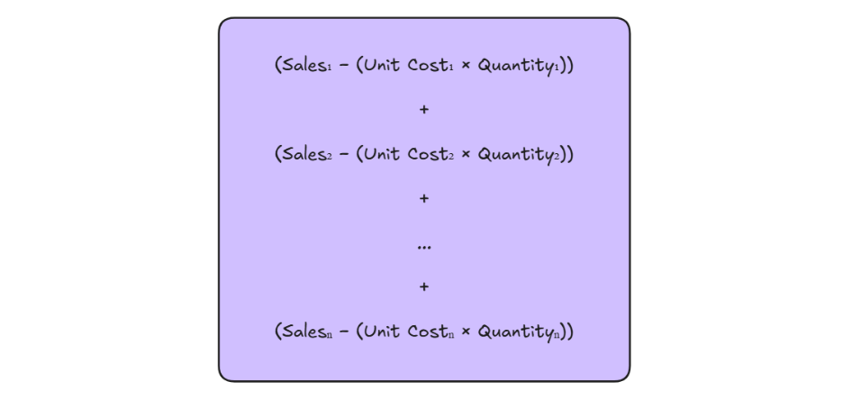 For every row in the Orders table, the formula first calculates Sales - (Unit Cost * Quantity). This gives the correct profit for each individual order. The SUMX() function then sums all of these row-level profit values to return the Total Profit for the given context, such as a specific Category: