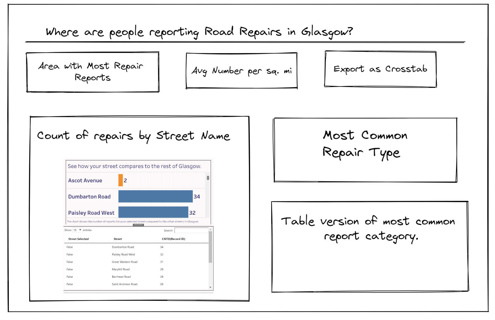 I started with a brief sketch on what I wanted the dashboard to look like and outlined the intention to import a new data source with some more geographical data based on the individual zones (Like boroughs), which make up Glasgow.