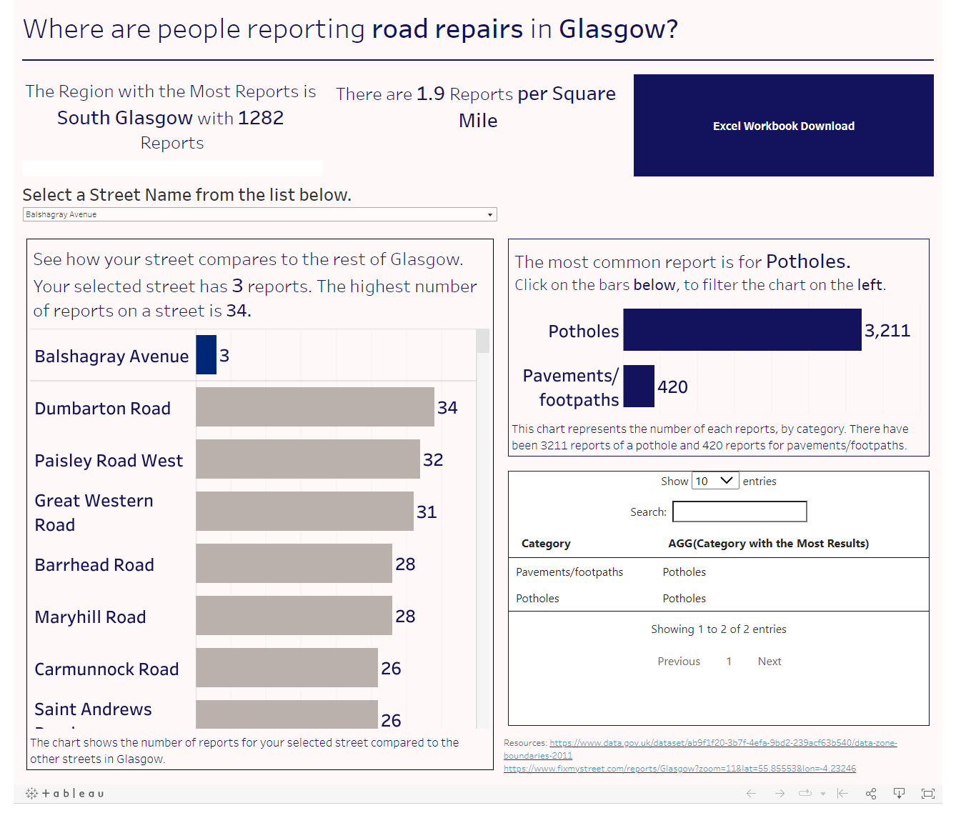 The first dashboard for dashboard week was based on street repair data in Glasgow, the aim of the dashboard was to help people who may have difficulties navigation existing interfaces.