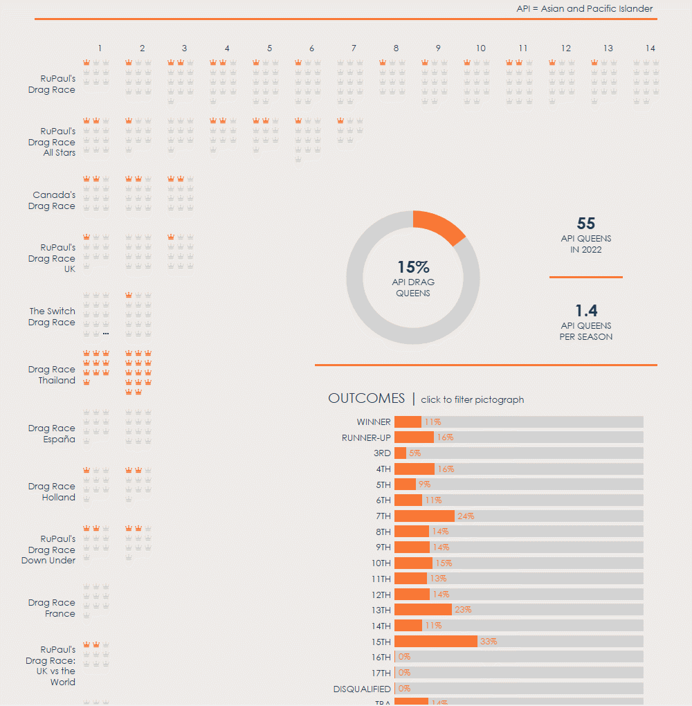 I always root for the Asian queens on Drag Race and wished to visualize the Asian and Pacific Islander (API) queens in each franchise and season, as well as their overall placements.