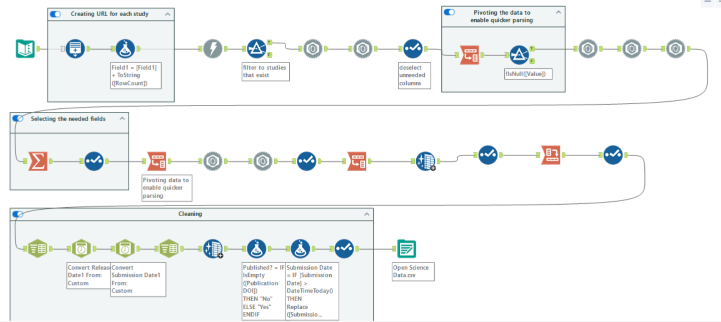 I have included a picture below of my workflow. The top two rows of tools are parsing out the fields and selecting the relevant ones. The first container is where I generated the numeric id codes for each study to be able to obtain the data for multiple studies at a time. Not all numbers had a corresponding study so after the download, I filtered to only keep studies that returned data - I got details fro 448 studies. The cross tab tools are present as I pivoted the data to have all the fields I wanted to parse out into one column so I could parse out the data more quickly than if they were in separate columns. The last row of tools is where I did a bit of general data cleaning. Each study had one or more factors but these were all in the same row, so I split this to rows, creating a new row for each different factor. I did the same thing for authors. I also had to convert the dates to a date data type.