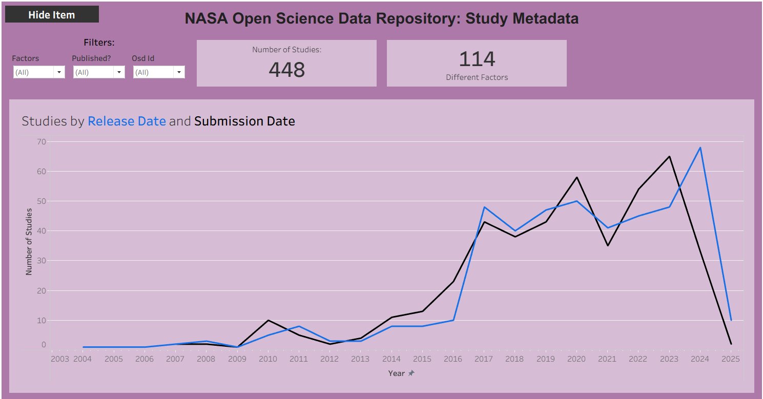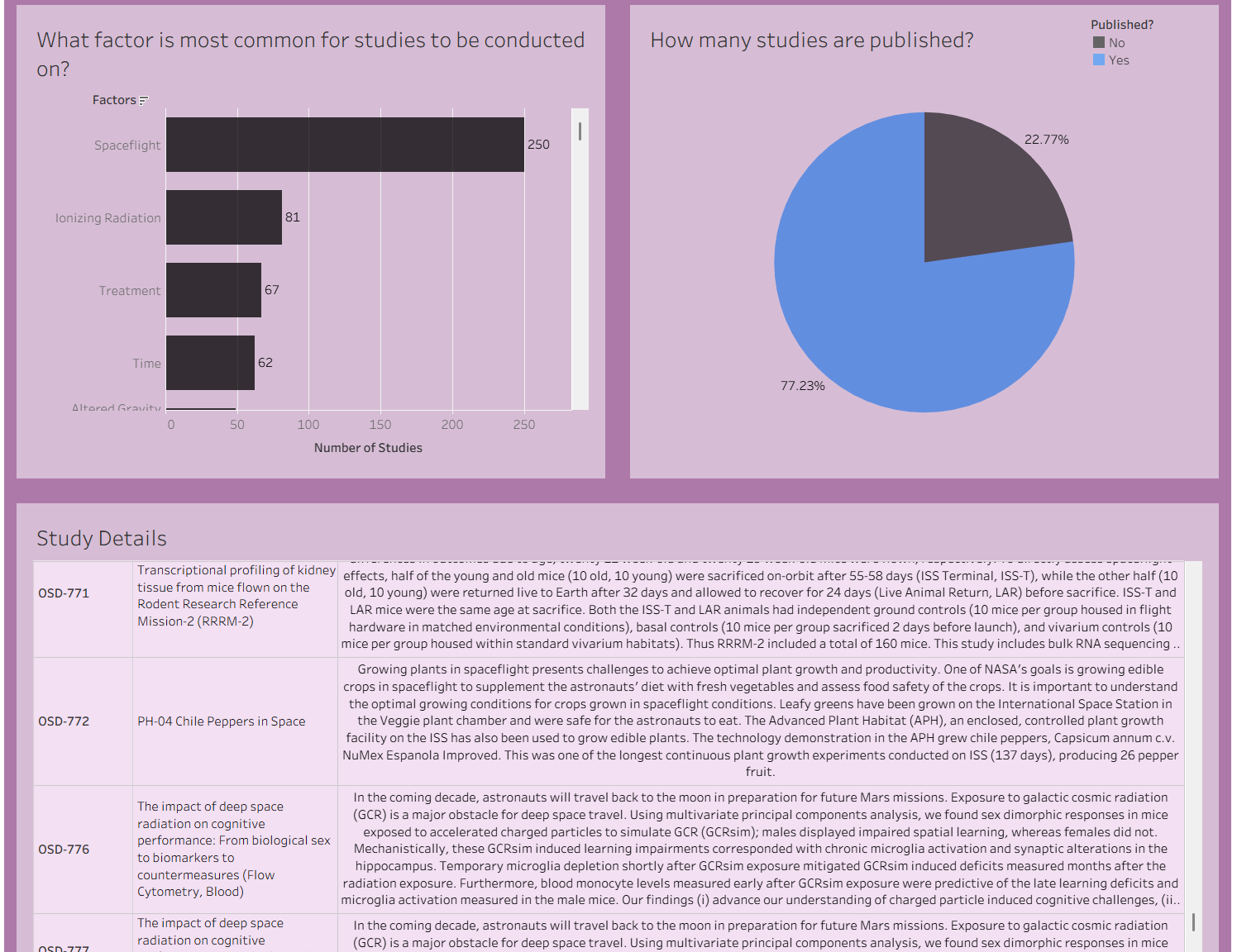 I used the Open Science Data Repository Public API which has data about different studies that NASA has conducted. I used the study Metadata API. I began parsing out the JSON that return from the URL and investigating the different fields - there were multiple. Once I had an idea of what was in the data, I narrowed down my scope to only include a handful of fields that would allow us to understand what types of studies were being conducted, whether they had been published, and when it had been released.
