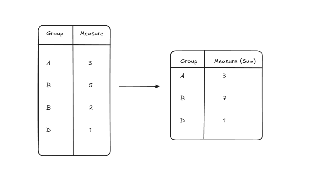 So what really is aggregation? It is a way of clustering certain measures based on a shared attribute. It's actually quite simple once you think it through a few times. You can think about it in visual terms or conceptual terms. I find it useful to think about the question it asks and the answer it gives. For example, with a simple data set, as shown below, you might want to ask what is the sum of measures which belong to group B. To answer that, you would aggregate the Measure column by Group and see the answer is 7!
