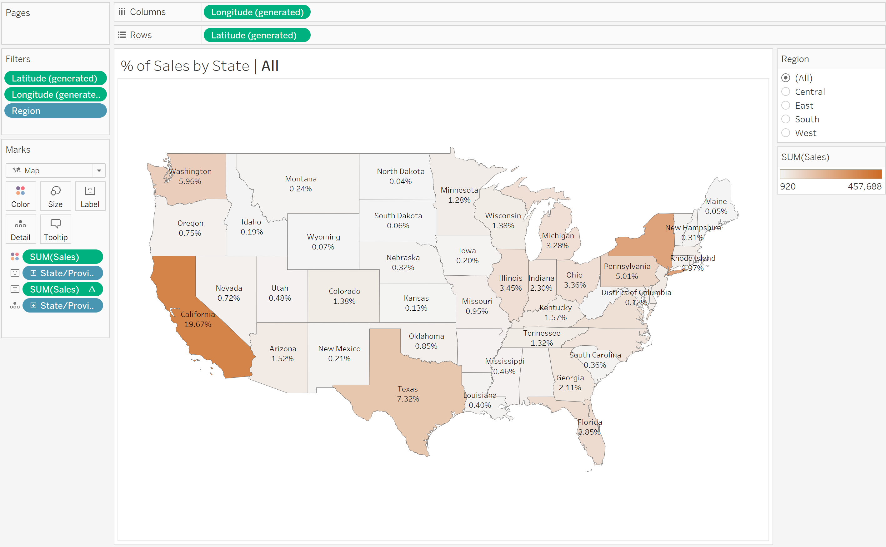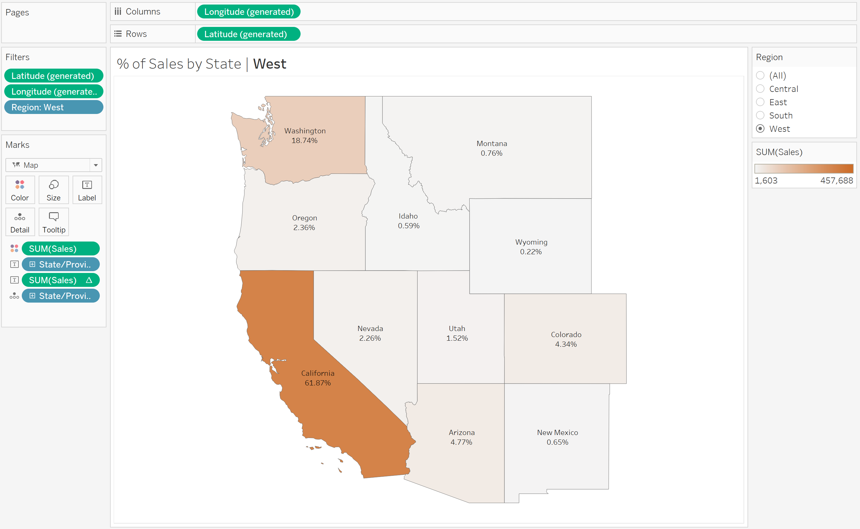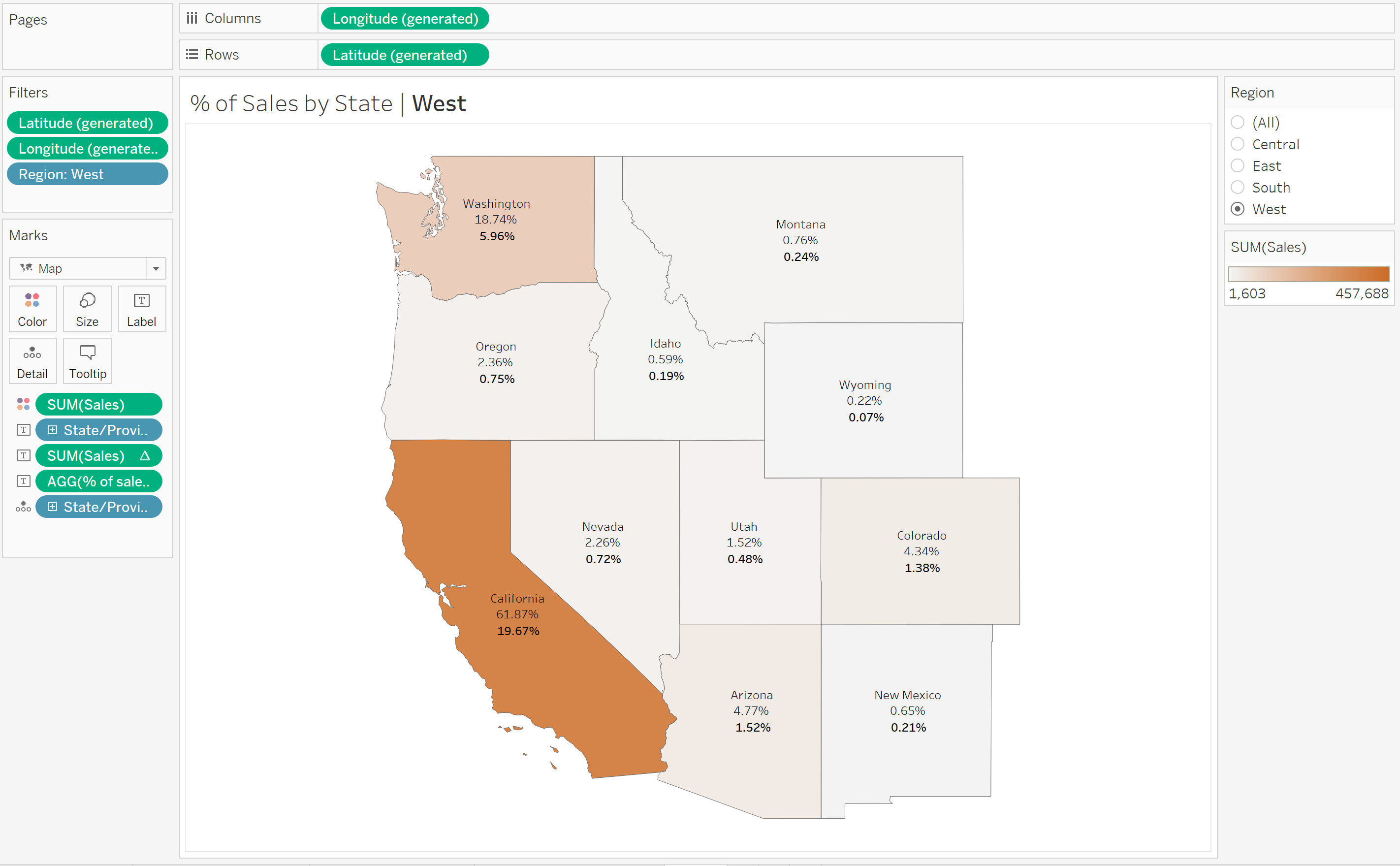 When we filter down to a specific region, the % of sales adjusts to show the proportion of sales as a % of that specific region. Notice, for example that the for Washington, the % of sales has changed from 5.96% (as a proportion of country-level total) to 18.74% (as a proportion of region-level total).