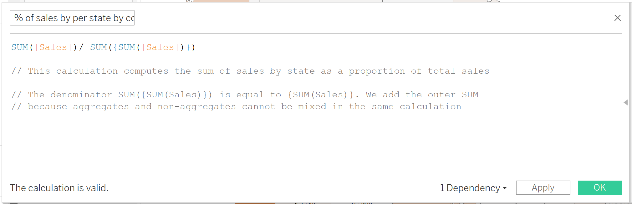 Now, if we wanted to see the % of sales in the country even when the Region filter is applied, we use a FIXED LOD: