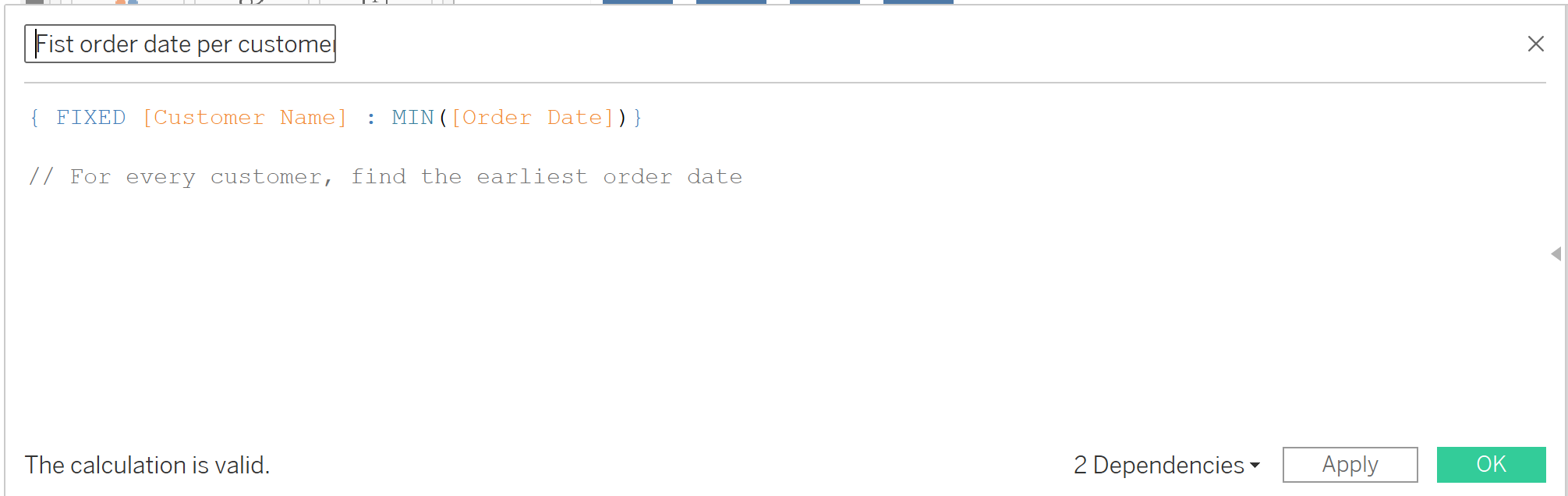 We begin by using a FIXED LOD to determine the earliest order date for every customer: