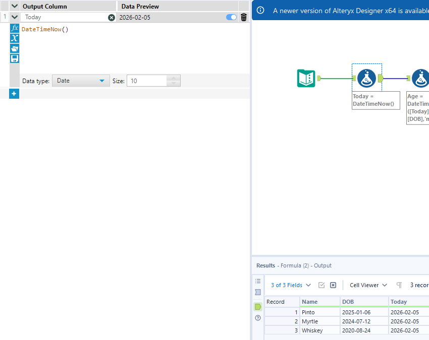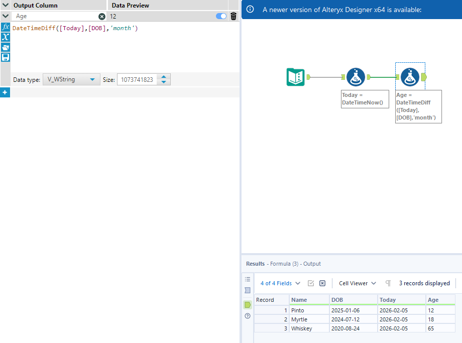 Step 3: For this particular example, I've then added a 'today' column and created a formula to establish their age (for some reason my initial response was to use months but we will be changing this later!) using a datediff function.