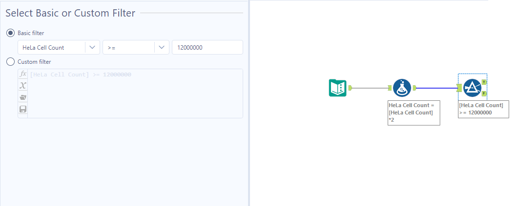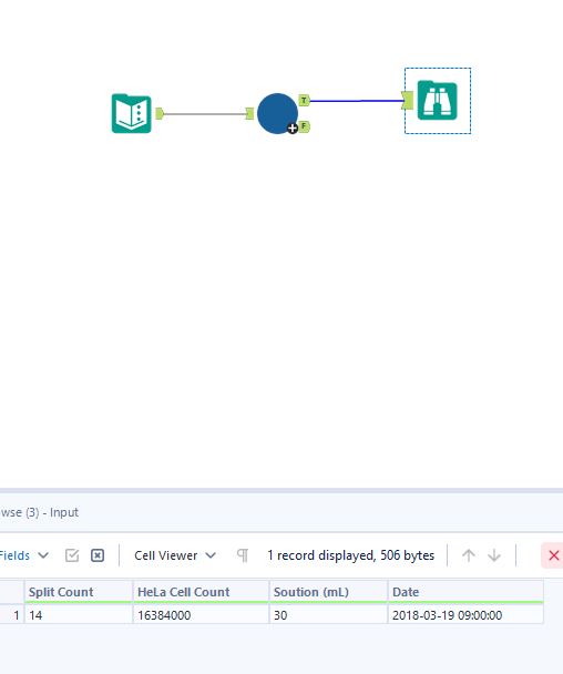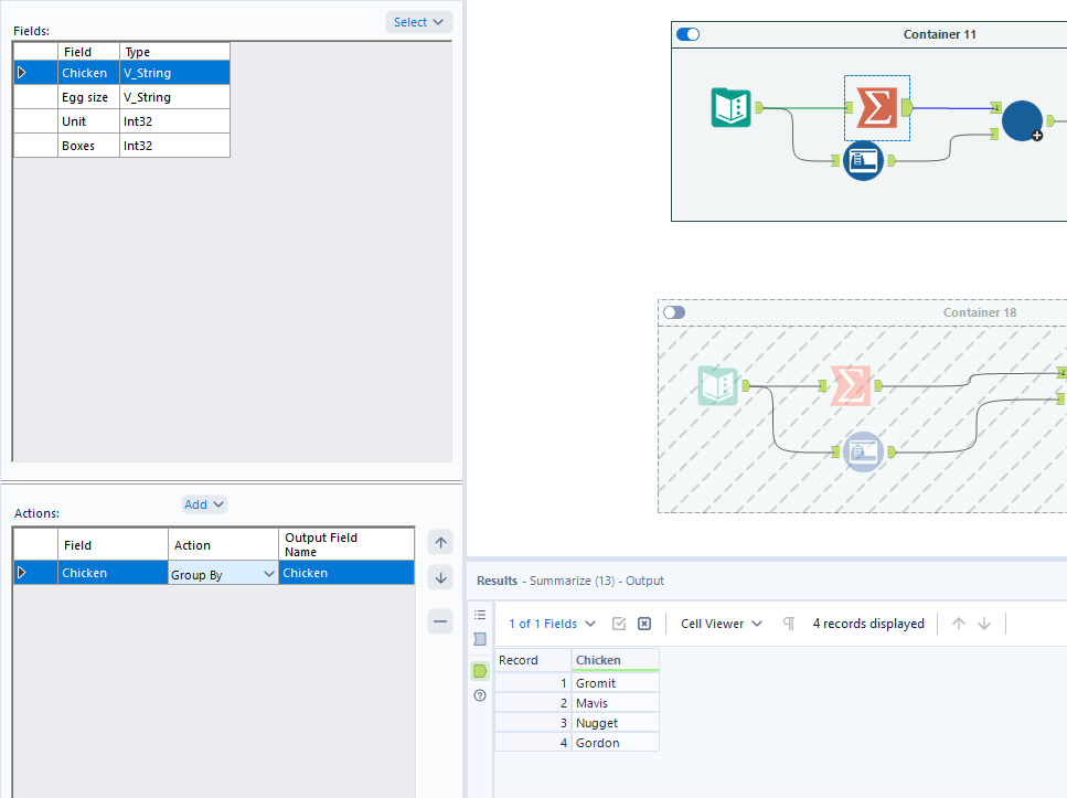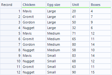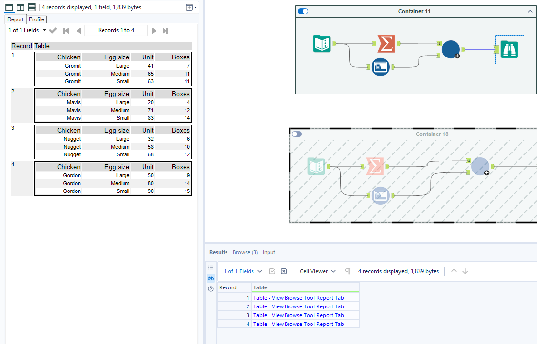 In this example, I've got a text input of chickens (I'm staying on theme), the size of egg and how many they've laid. I want to use the batch macro to create a separate table for each chicken. Similar to the iterative example, I'd recommend starting by creating one iteration and then transforming into the macro, although I will explain after how to do it slightly differently.