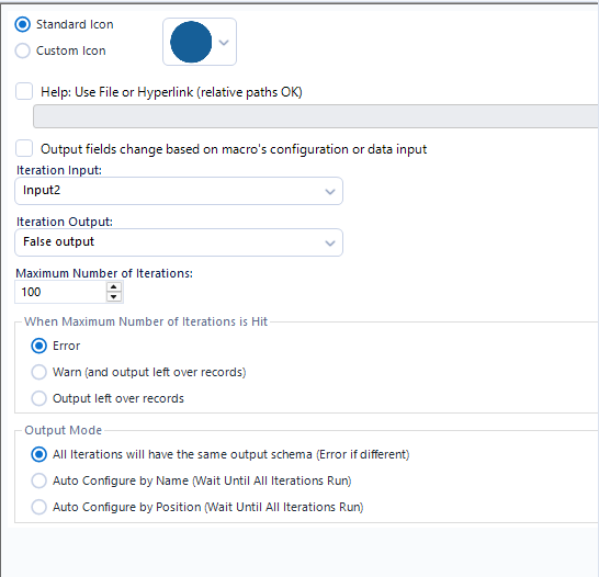 Step 6: Set up the iterative part of the macro. Go to View > Interface designer. It should pop up next to your workflow configuration. Then make sure that your iteration output is set to whatever is coming out of your false filter (I called mine False output). Depending on however many iterations you think you'll need, you can also change the maximum value in this interface. This is also where you can change your icon design if you want to make it more exciting!