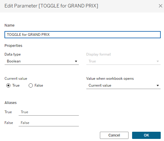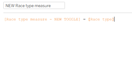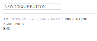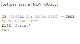 Calculation 1: Setting what your true/false parameter means in terms of your chart. This is when you specify the two categories in your categorisation field that you're toggling between. For me, this was setting whether the race type was a grand prix or a sprint. Remember, case sensitivity and spelling is crucial here.