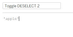 To explain how this works, essentially you're using a filter to say when my toggle is clicked I want to filter my 'toggle deselect 1' field to equal my 'toggle deselect 2' field. But banana can never be equal to apple so it automatically clears the selection to show all values. By clearing the selection, it means your toggle is essentially unclicked and back to square 1 so you can now click it afresh to toggle the first time around.