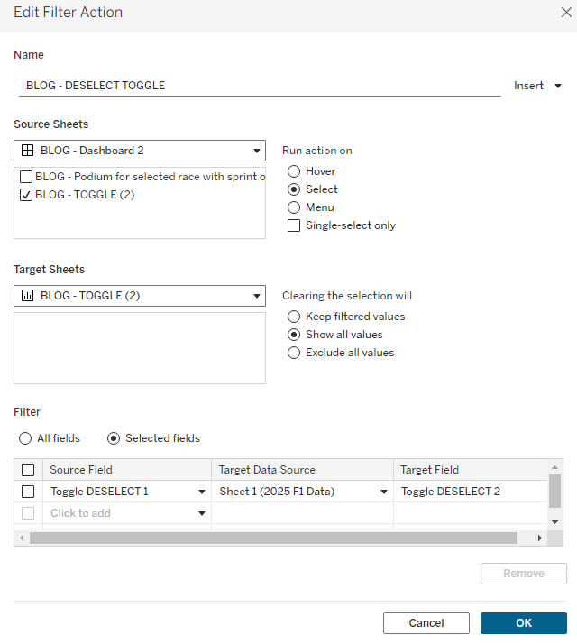 Step 9: Add a filter action in your dashboard. Follow the exact steps that I have carried out in the screenshot below. Note, I have used a filter action specifically and that the target sheet is not the dashboard but the toggle sheet itself. If your toggle disappears when you clicked it, make sure that you have 'show all values' when clearing the selection. If it's still gone, make sure you remove the action from your filter pane in the worksheet and try again.