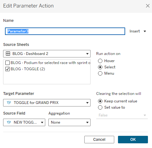 Step 7: Create your toggle dashboard action. Go to dashboard > actions and change parameter then set it up as I have done below. Now try it out in your dashboard! It should work although you will have to double click your toggle to get it to deselect and toggle again, as I spoke about at the start of this blog post (all that time ago!). That's the pesky little issue that we will be sorting next.