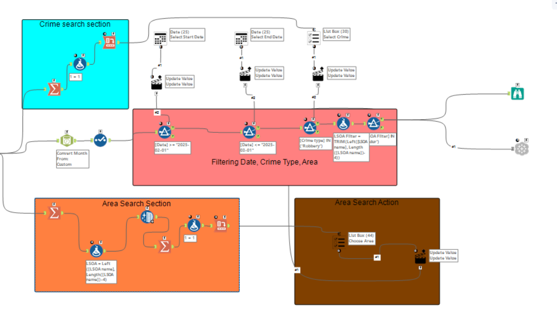 The Crime Search Section (Blue) and Area Search Section (Orange) work together to prepare the dataset for user-driven filtering within the Alteryx app. The Crime Search Section summarises the available crime categories from the data and presents them through an interactive List Box tool, allowing users to select one or multiple crime types for analysis. I also used the summarise tool to create a crime type list remains clean and accurate. Together, these sections set up the dynamic inputs needed for the user to customise their analysis by both crime type and location.