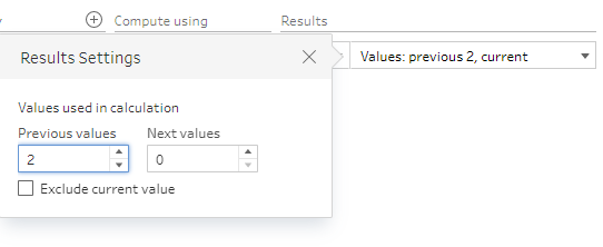 Results: This is the adding bit you want the calculation to do. For this example, we want to set this to the average. We also need to specify the number of values that average calculation needs to consider the last 3 months (the current month and the previous two), which is achieved as follows...