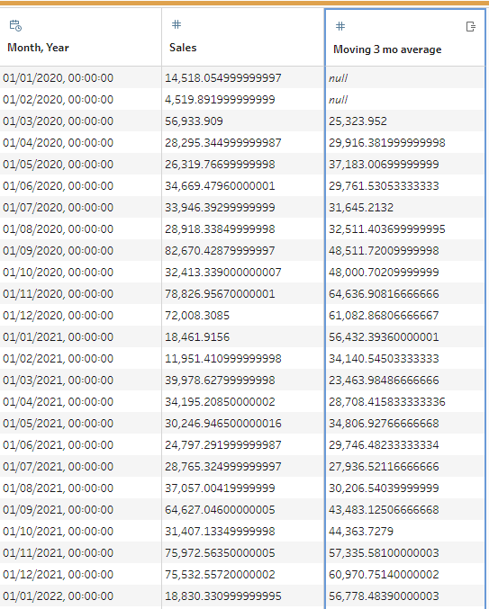 Notice that the first two values in the moving average field are null. This is because a 3 month average cannot be calculated for them, where there aren't 3 months worth of sales yet. Don't panic, these nulls are good sign (for a change!) Now you can output that data, and go make some pretty graphs...