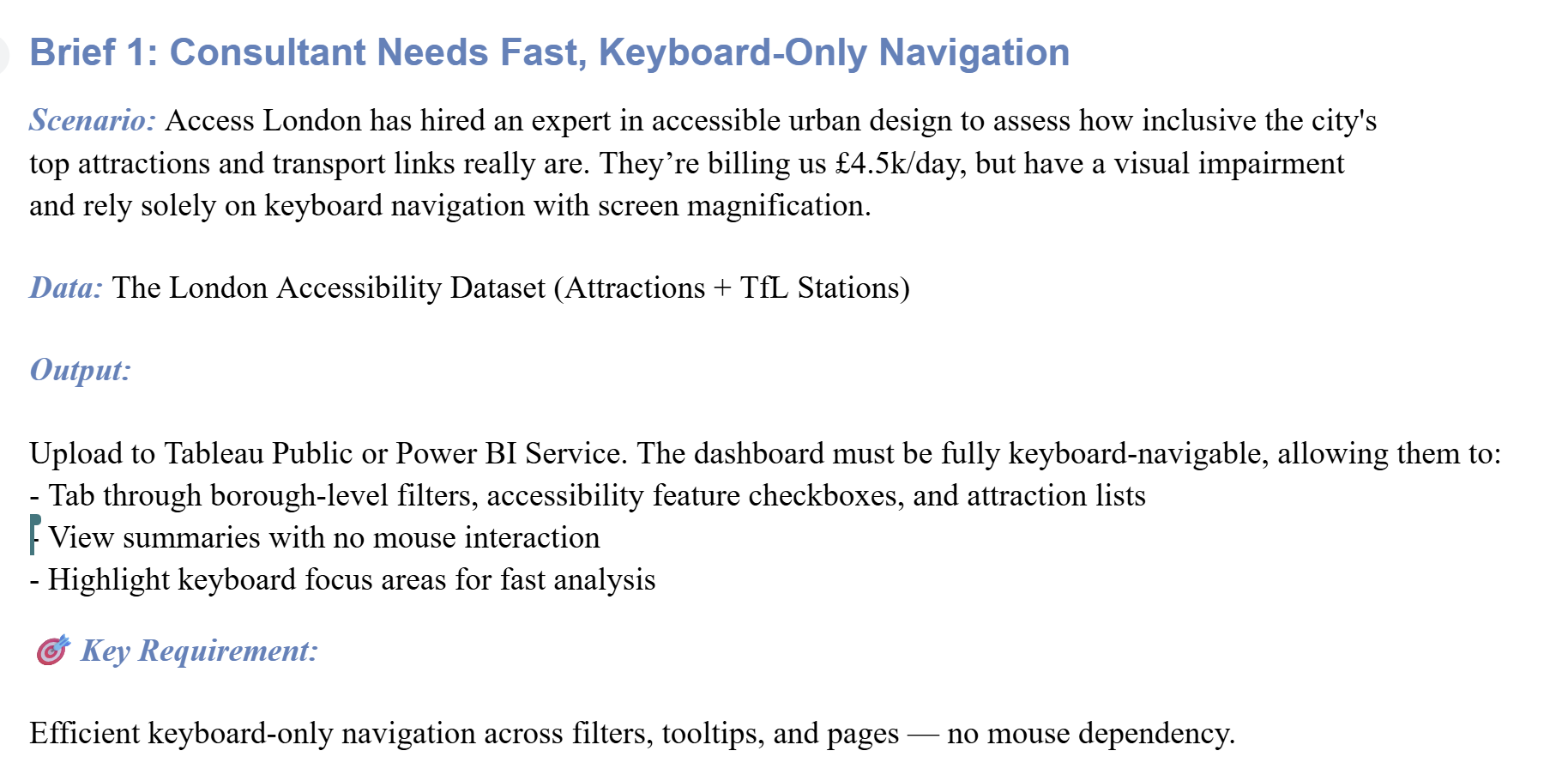 Overall, I'm quite pleased with how this ended up. I kept the colours extremely basic as I wasn't aware of the nature of the client's visual impairment, and the dashboard and key findings can be accessed via keyboard navigation only.