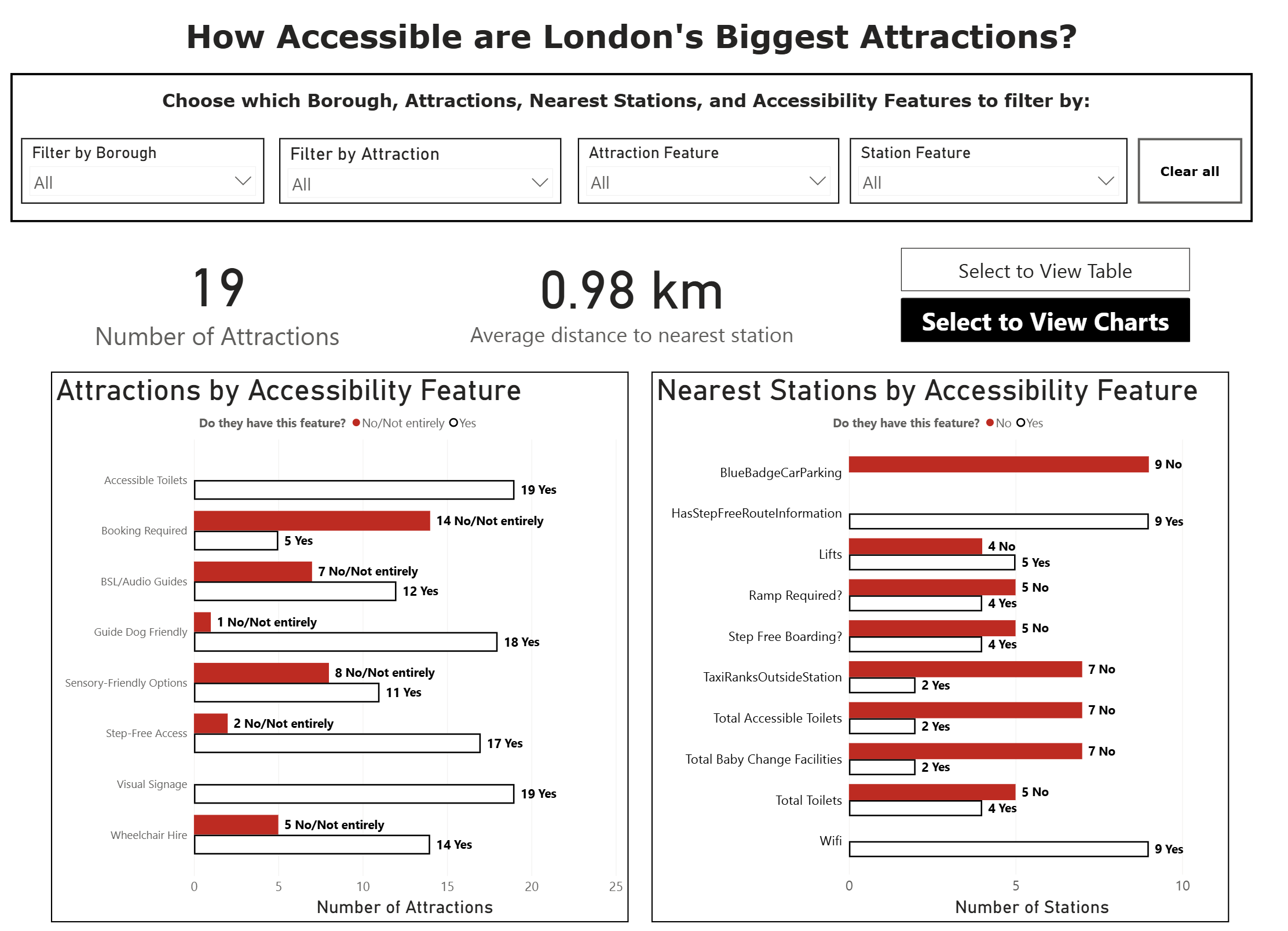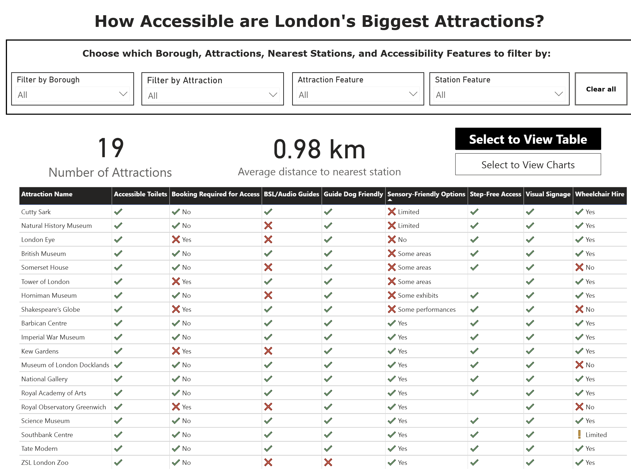 As I wanted to look at the number of attractions with certain accessibility features, I ended up pivoting my datasets so these aspects could be compared/filtered more easily. Other cleaning aspects I did was to ensure relationships could be built in Power BI. Overall, the data was nicely laid out so not much was done.