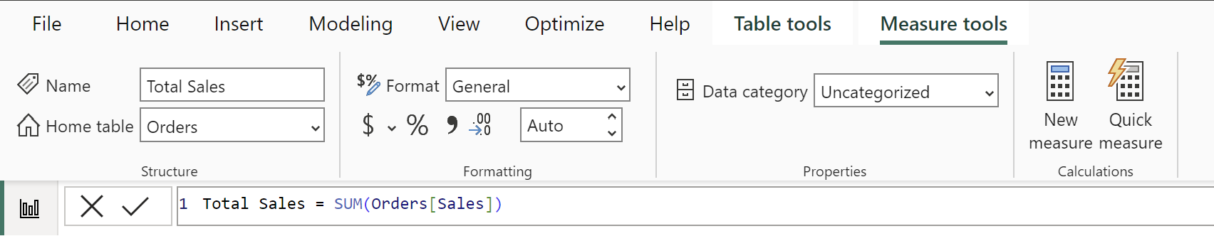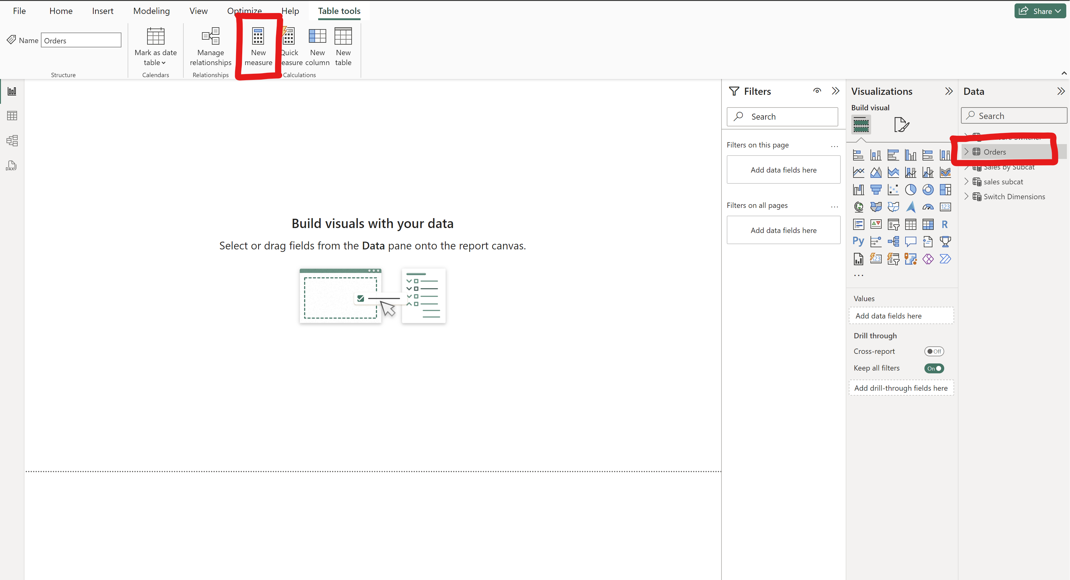 Firstly, click on your table (in my case the Orders table) in the 'Data' pane and find 'Table tools' >> 'New Measure'.