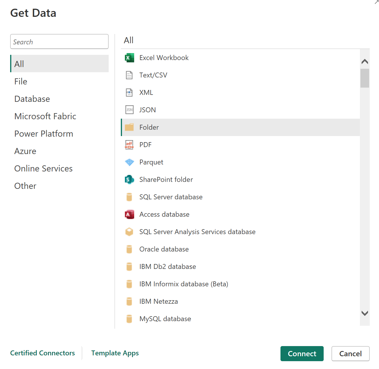 Now, in PowerQuery go to Get Data>> More, and select Folder.